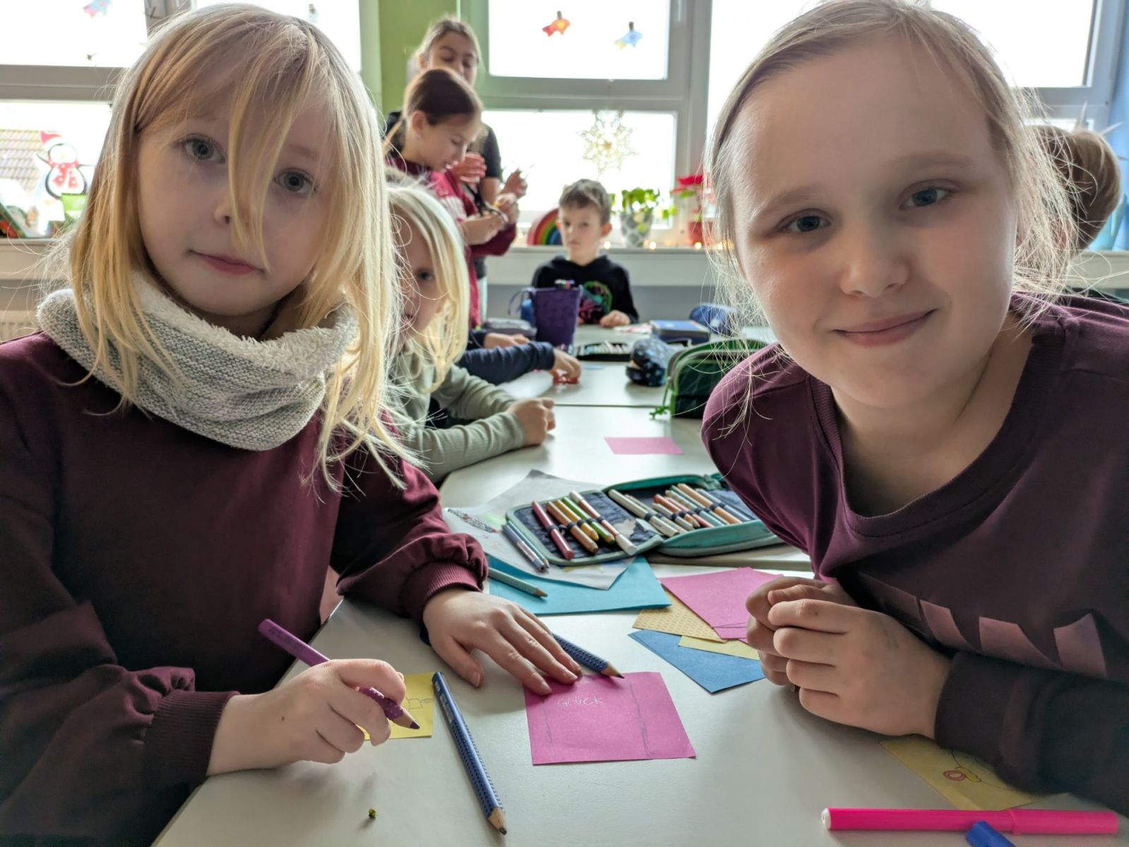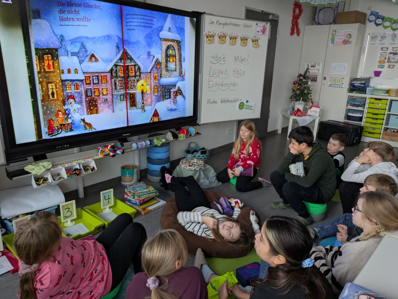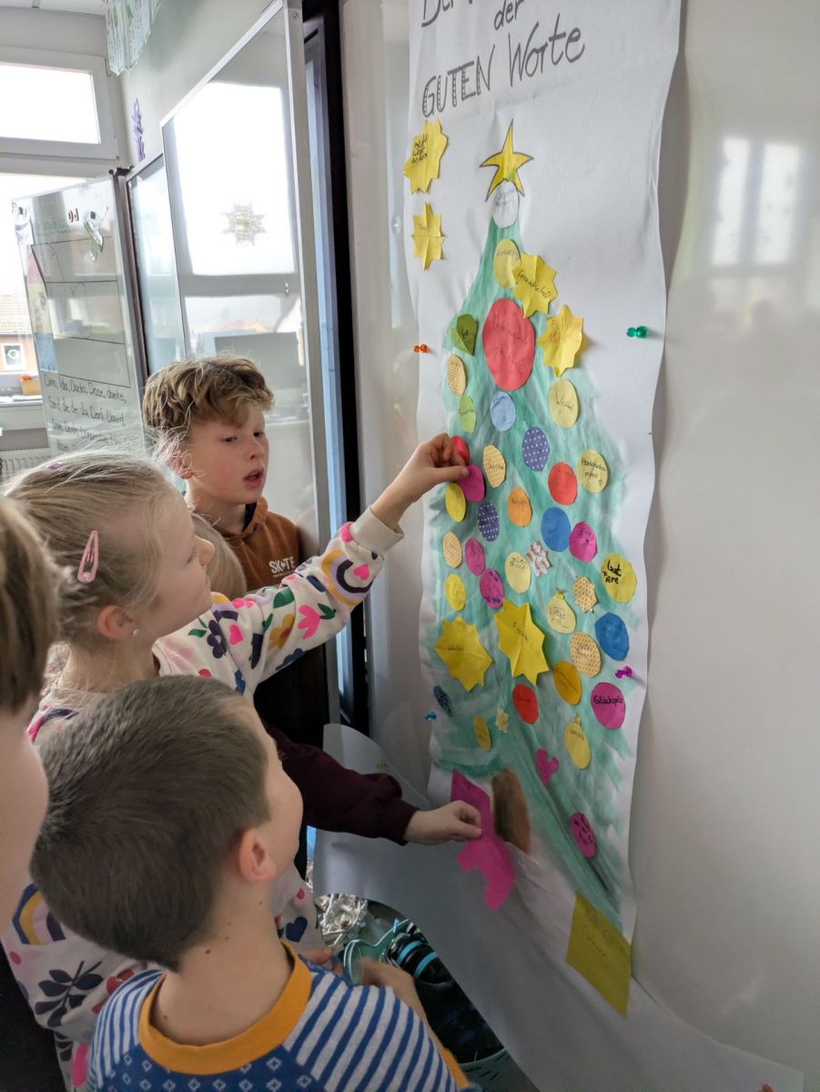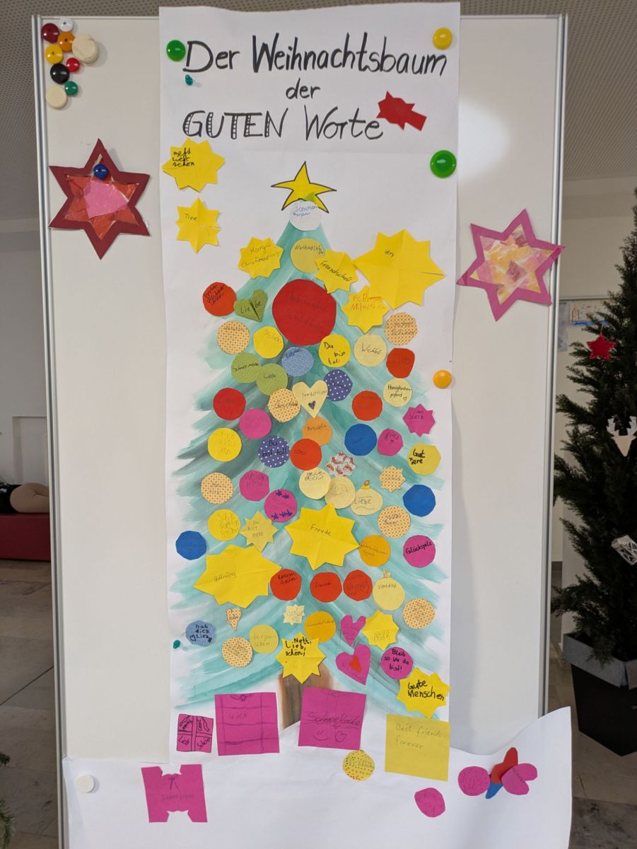Die Patenkinder aus beiden Klassen trafen sich am vorletzten Schultag, um miteinander die Weihnachtszeit einzuläuten. Ganz gebannt lauschten alle der Geschichte von der kleinen Glocke, die anfangs nicht erklingen wollte und dann so schön läutete. Erfüllt von den schönen Worten der Geschichte fanden auch die Patenkinder miteinander besondere und zauberhafte Weihnachtswörter, die sie auf Kugeln und Sterne schrieben und so einen wunderschönen Christbaum erschufen.