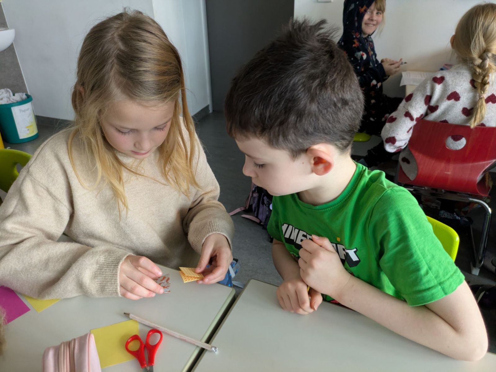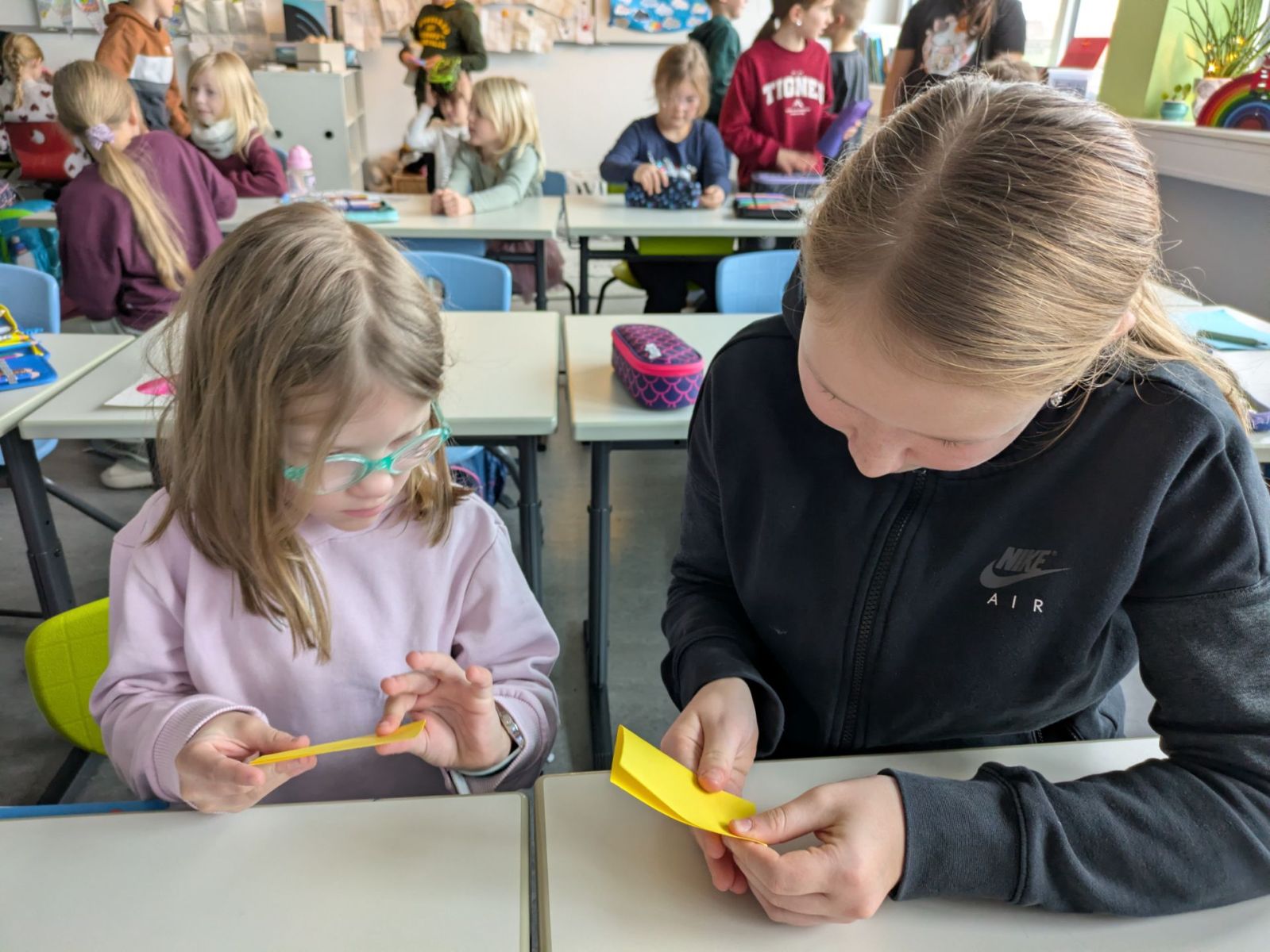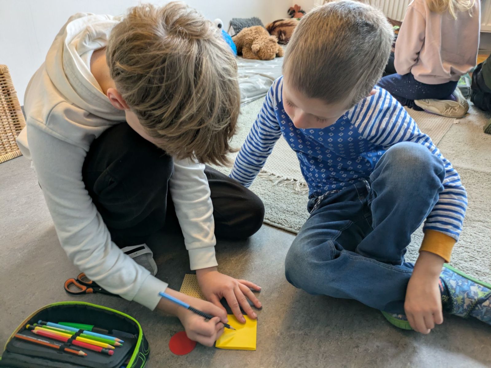 Die Patenkinder aus beiden Klassen trafen sich am vorletzten Schultag, um miteinander die Weihnachtszeit einzuläuten. Ganz gebannt lauschten alle der Geschichte von der kleinen Glocke, die anfangs nicht erklingen wollte und dann so schön läutete. Erfüllt von den schönen Worten der Geschichte fanden auch die Patenkinder miteinander besondere und zauberhafte Weihnachtswörter, die sie auf Kugeln und Sterne schrieben und so einen wunderschönen Christbaum erschufen.