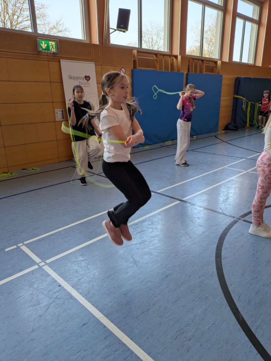 Unter dem Motto „Seilspringen macht Schule“, ein kostenloses Präventionsprojekt der Deutschen Herzstiftung lernten die Kinder unter der professionellen Anleitung von Frau Pülz wichtige Informationen zum menschlichen Herzen kennen und den eigenen Puls zu fühlen.