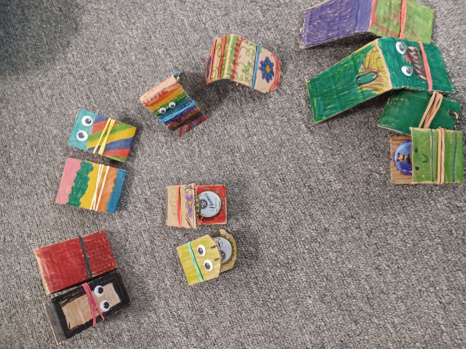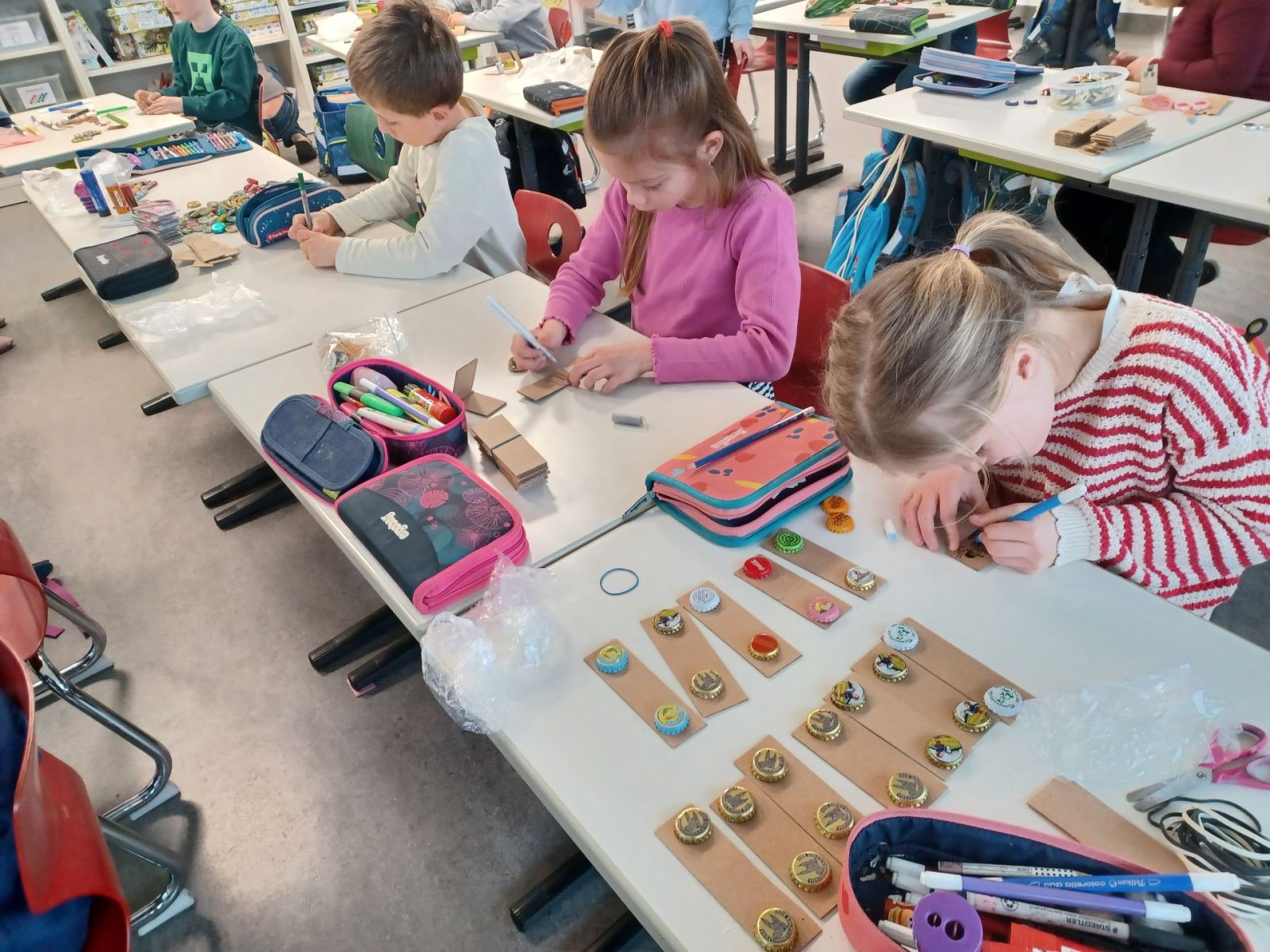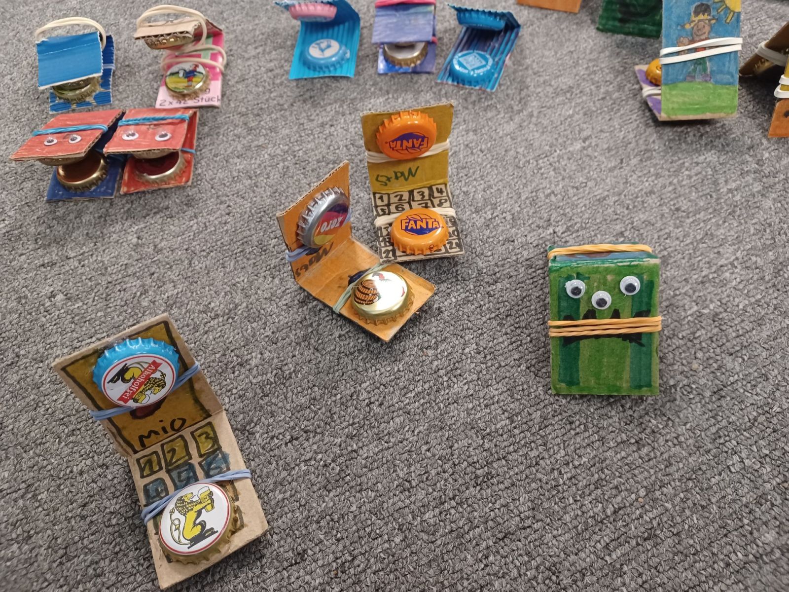 Kastagnetten aus Karton und Kronkorken wurden in den zweiten Klassen hergestellt. Auch hier verzierten die Kinder die Kartonstreifen mit bunten Farben, bevor anschließend die Kronkorken darauf geklebt wurden.