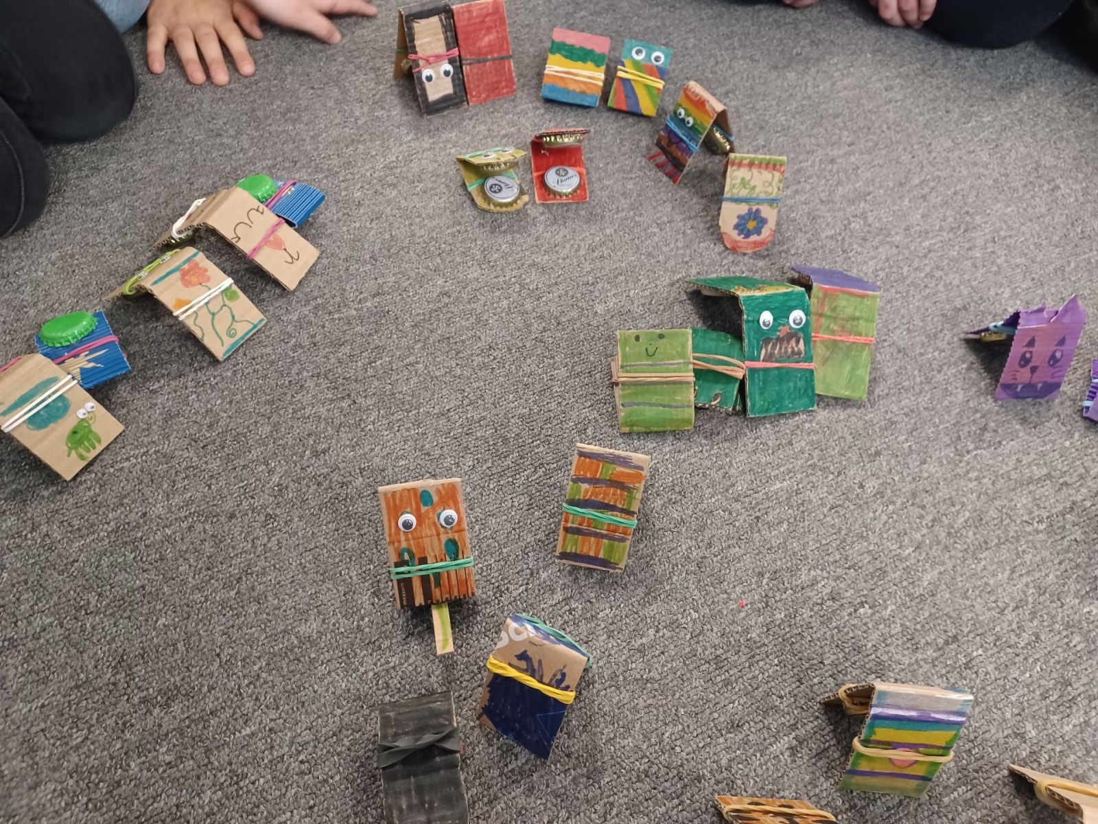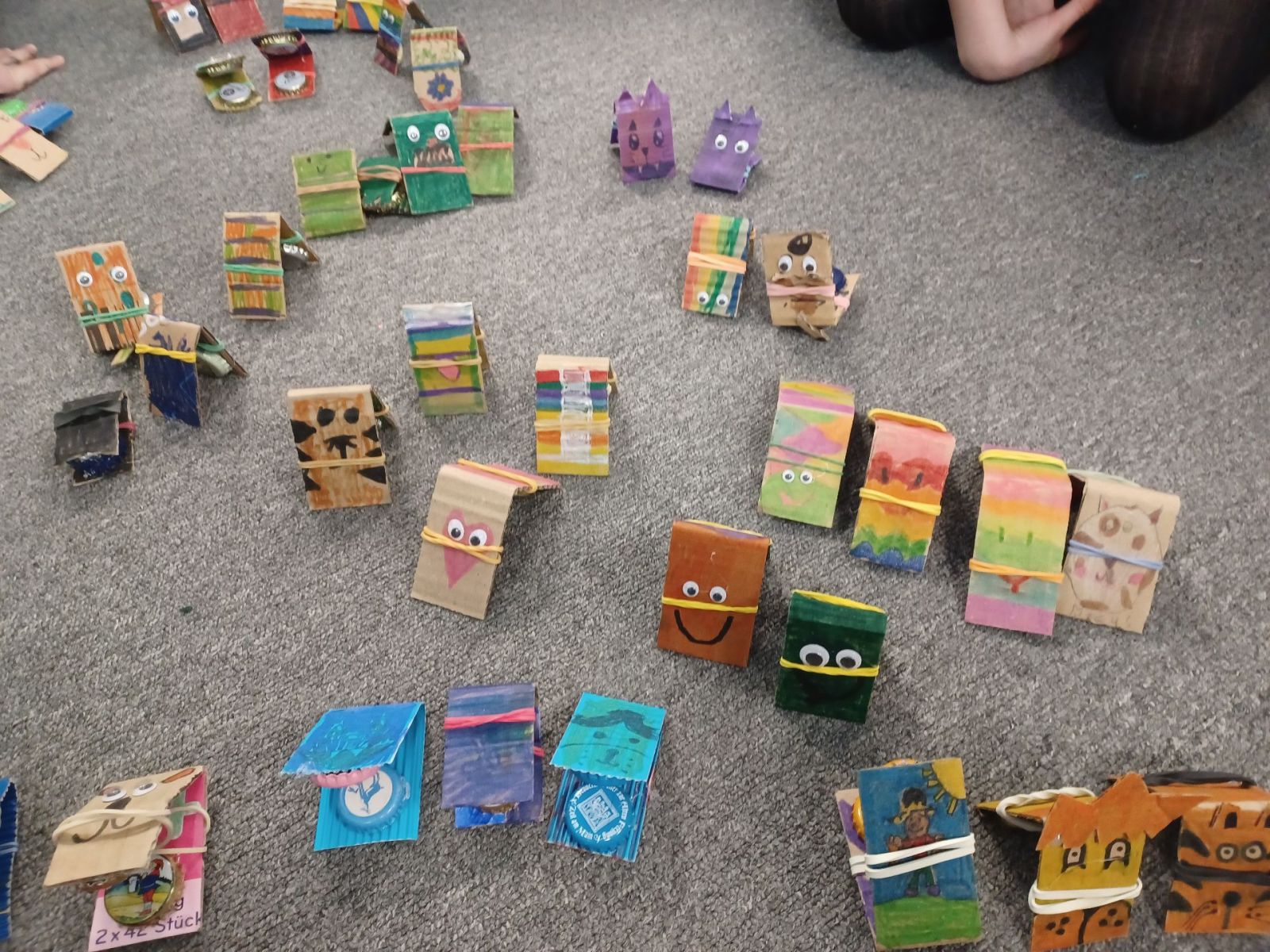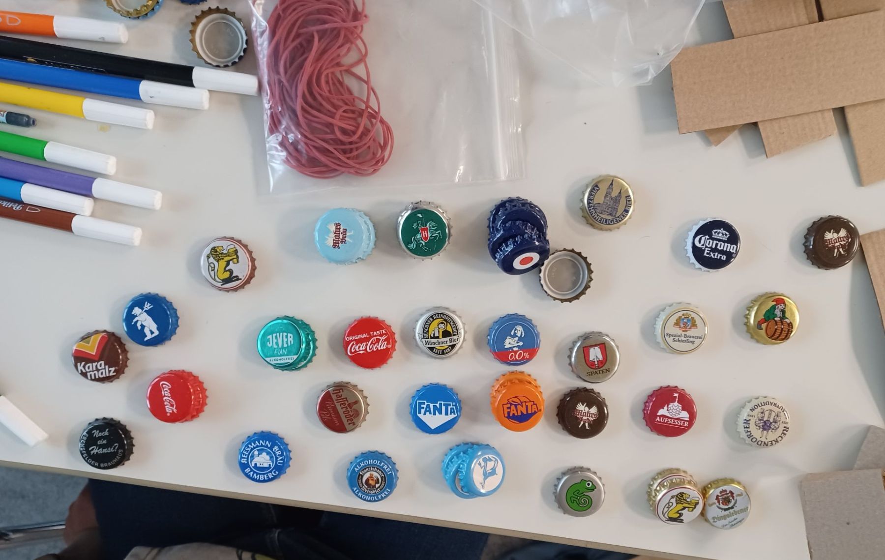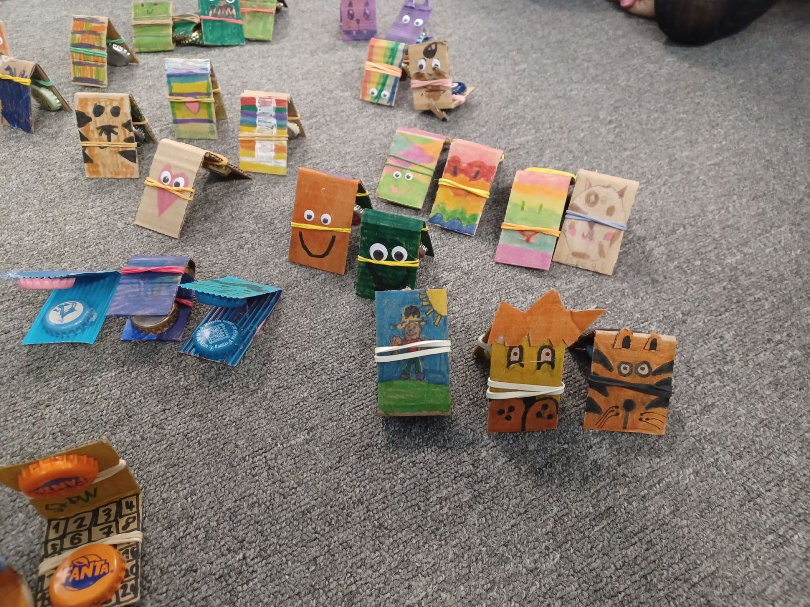 Kastagnetten aus Karton und Kronkorken wurden in den zweiten Klassen hergestellt. Auch hier verzierten die Kinder die Kartonstreifen mit bunten Farben, bevor anschließend die Kronkorken darauf geklebt wurden.