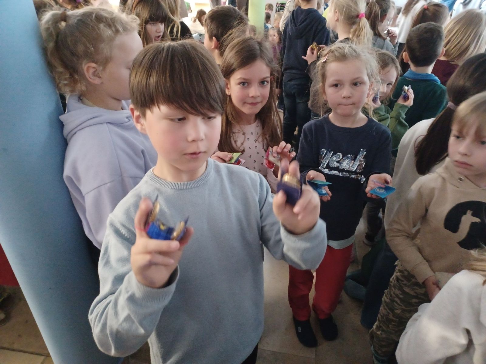 Zum Abschluss versammelten sich alle Kinder erneut in der Aula. Dort wurden die selbst gebastelten Instrumente stolz präsentiert. Gemeinsam erklangen in einem stimmungsvollen Chor noch einmal unsere beiden Lieder, diesmal begleitet von den selbstgemachten Instrumenten – ein ganz besonderes Erlebnis!