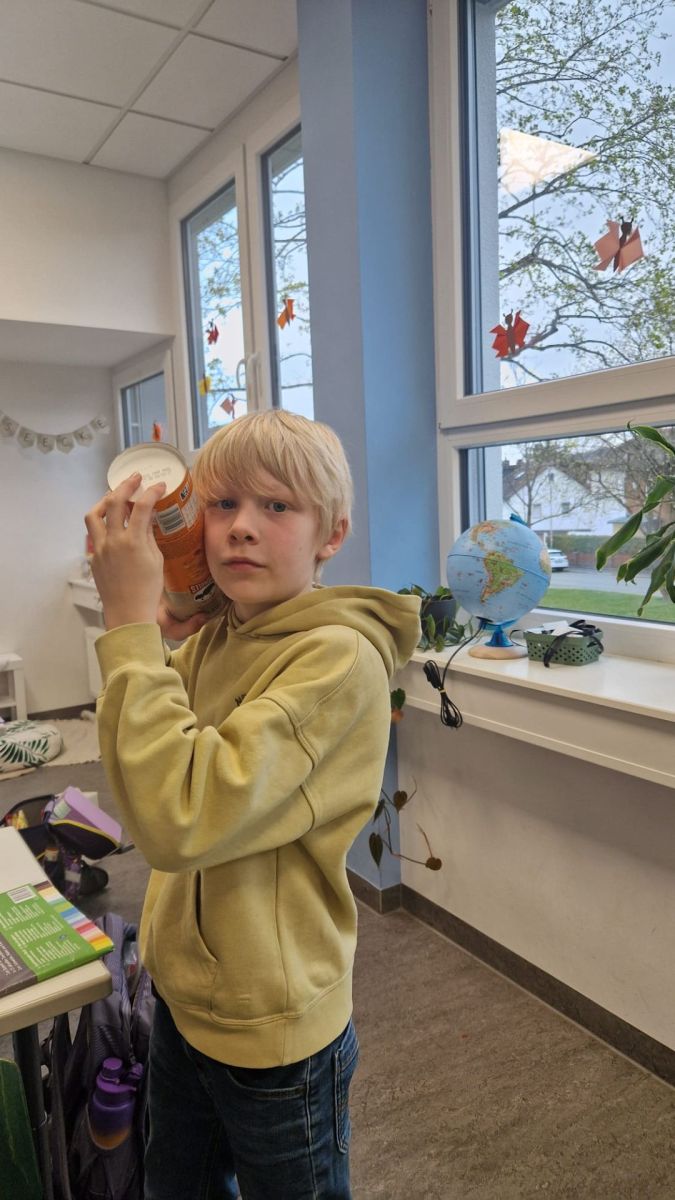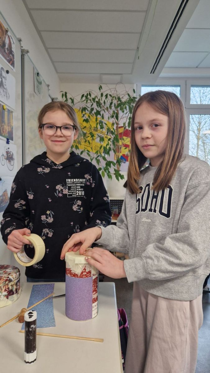 Ebenfalls aus Dosen bauten die vierten Klassen Trommeln und nutzten Korken an Holzspießen als Trommelstöcke. Durch die unterschiedlichen Größen der Dosen erzielten die Kinder auch hier individuelle Klänge ihrer Trommeln.