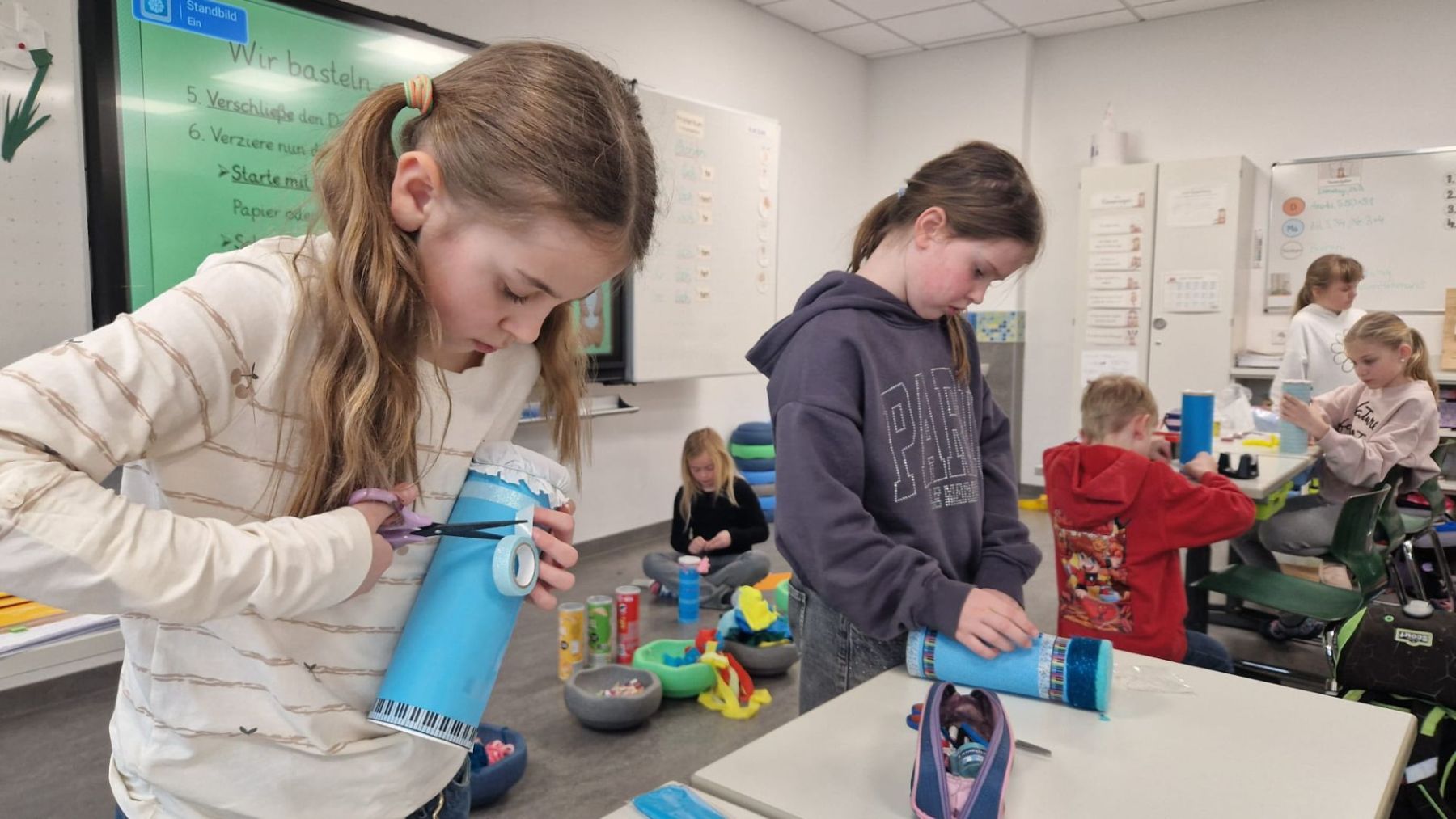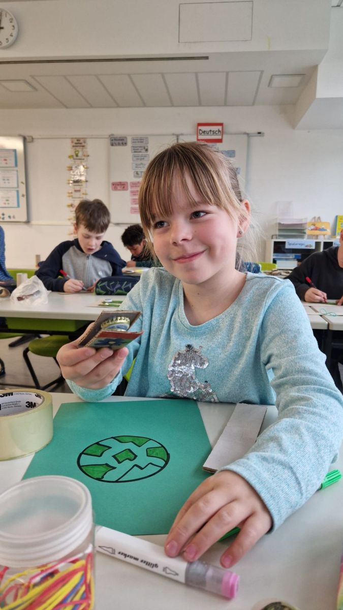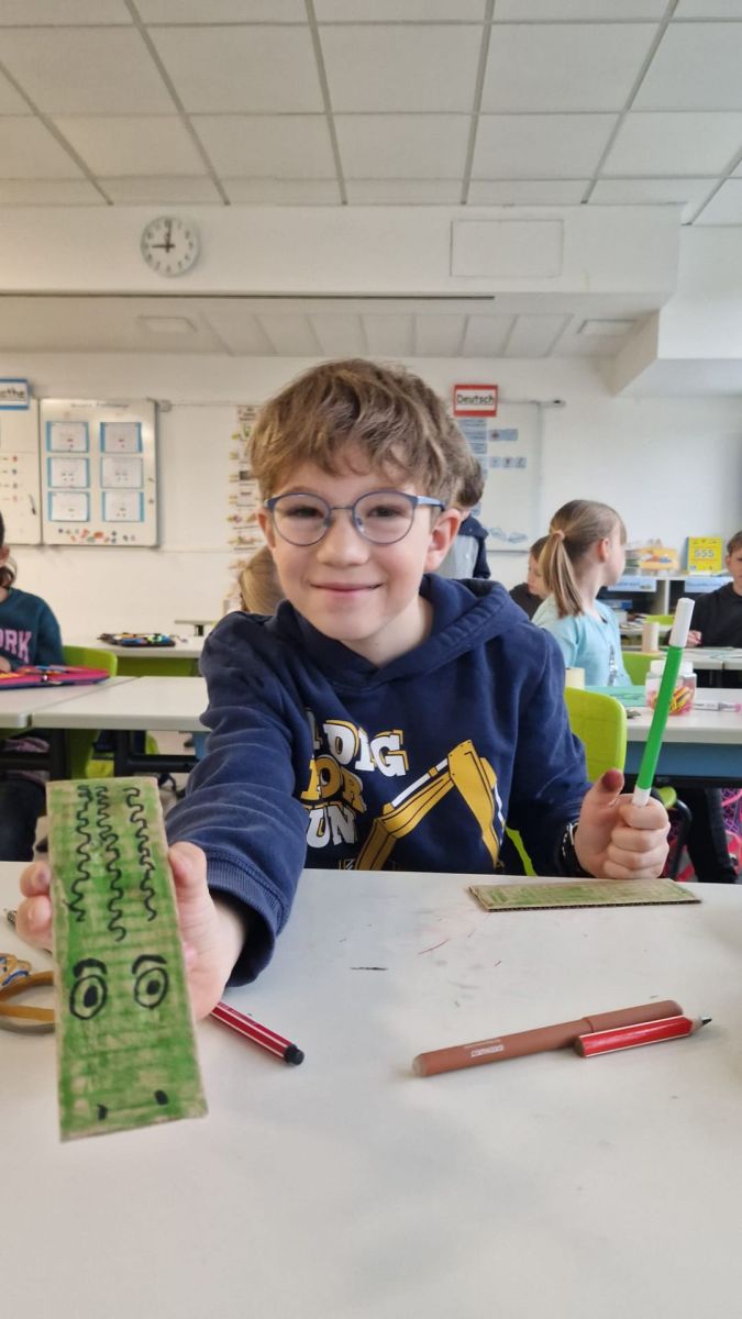 Anschließend ging es in den Klassenzimmern kreativ weiter: Im Sinne des Upcyclings bastelten die Kinder ihre eigenen Musikinstrumente aus mitgebrachten Materialien. So entstanden zahlreiche kreative und individuelle Instrumente.